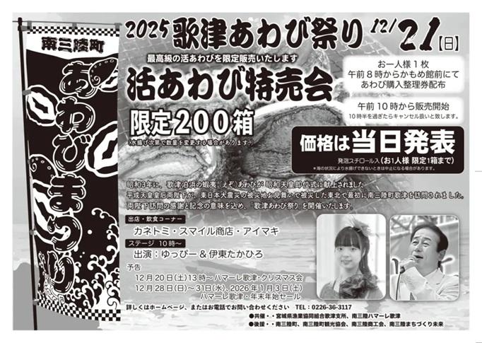 2025年12月21日、南三陸ハマーレ歌津かもめ館前特設会場(本吉郡南三陸町歌津字伊里前100-4)にて「南三陸歌津あわび祭り」が開催されます。整理券GET をお忘れなく 昭和3年、歌津泊浜のあわびが昭和天皇即位式に献上され、東日本大震災後は被災地応援として平成天皇皇后両陛下が被災した東北で最初に南三陸歌津を訪問。この両陛下の訪問に対しての感謝と祈りの意味を込め開催されている祭りです。最高級の活あわびが200箱、破格値(価格は当日発表)で限定販売されるほか、飲食コーナー、ステージイベントなどで盛り上がります。整理券の配布などが行われるので、詳細は公式サイトでチェックを。 入場無料。開催時間は8時から(あわびの販売は10時から)。