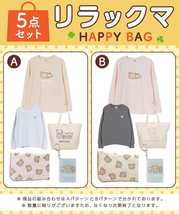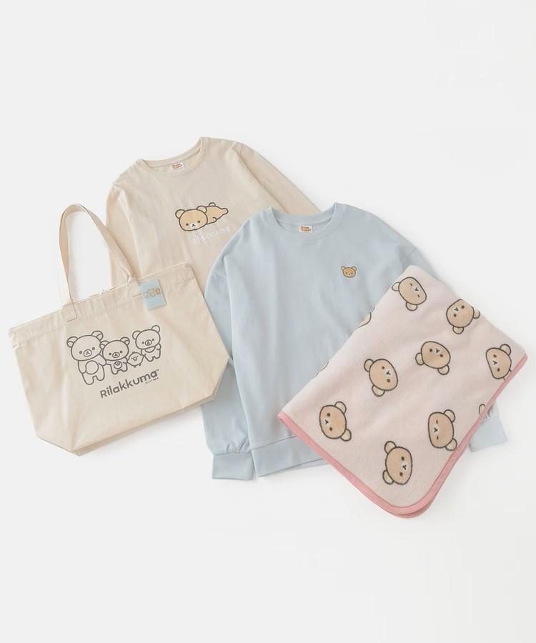 サンエックスの人気キャラクター「リラックマ」を描いた、長袖Tシャツ、裏毛トレーナー、トートバッグ、ブランケット、キーホルダーの計5点セット。