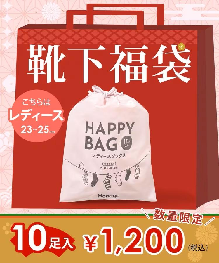 23~25cmのレディース靴下が計10足入った、毎年人気の福袋。アイテムとカラーはランダムです。