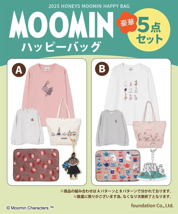 生誕80周年を迎えた人気キャラクター「ムーミン」を描いた、長袖Tシャツ、裏毛トレーナー、トートバッグ、ブランケット、キーホルダーの計5点セット。