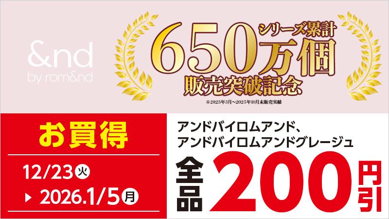 12月23日から26年1月5日までの期間、「アンドバイロムアンド」「アンドバイロムアンドグレージュ」各種が200円引きで購入できます。