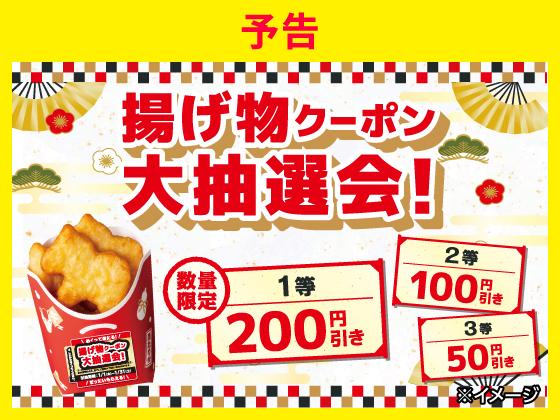 26年1月1日から31日までの期間、ウマなげを購入してパッケージに付いているシールをめくると、次回使える揚げ物値引きクーポンが必ずもらえます。