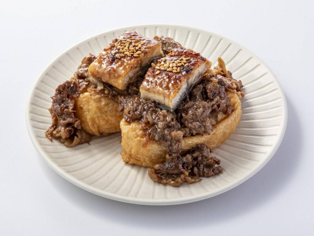国産黒毛和牛とスタミナ満点のうなぎ蒲焼を贅沢に盛り付けた、ボリュームたっぷりのいなり寿司。旨味あふれる牛肉と厚切りうなぎを一緒に楽しめる限定メニューです。
