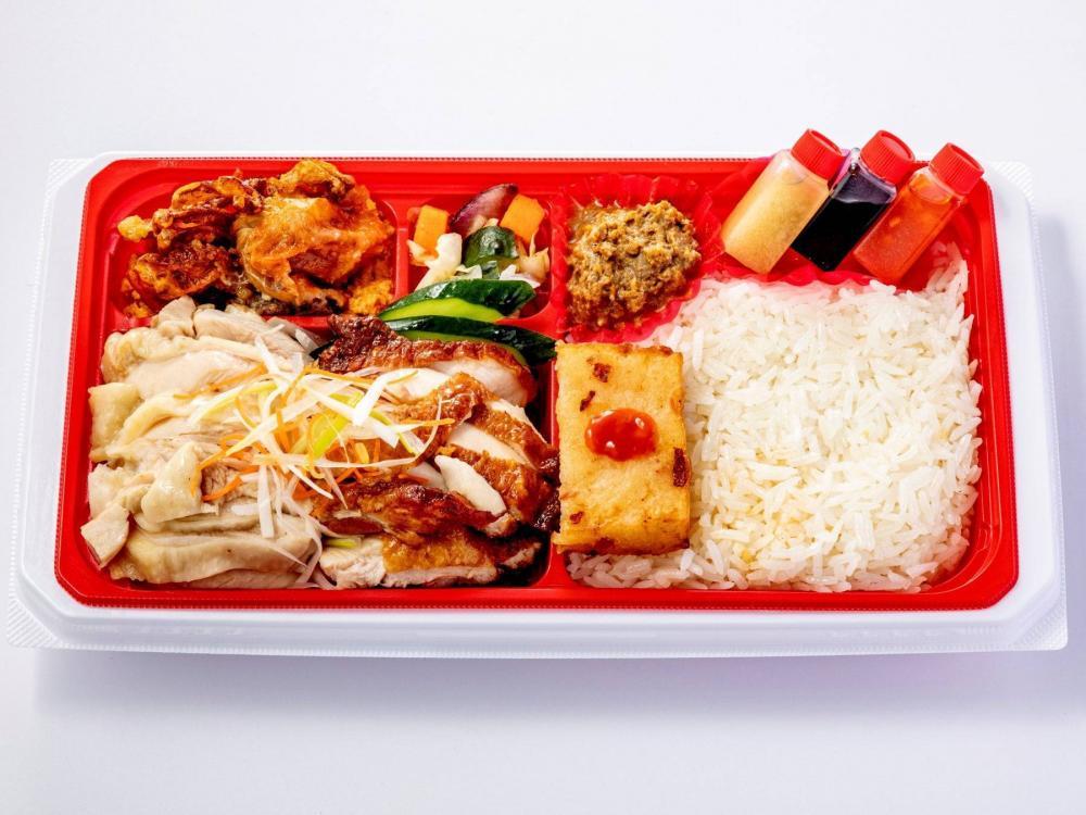 通常のミックス弁当と比較して、チキンは2倍、ご飯大盛り、さらにチリクラブやビーフレンダン、大根餅などシンガポール料理を詰め込んだ豪華弁当。ボリューム満点で、食べ応え抜群の一折です。
