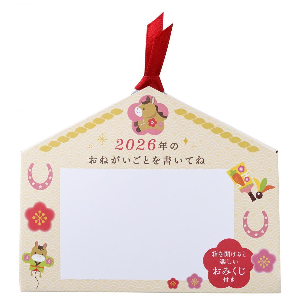 26年の干支"午"が描かれた絵馬型ボックスに、鏡餅と午をデザインしたクッキーをアソート。ボックス内側のツメ部分には、おみくじが付いています。