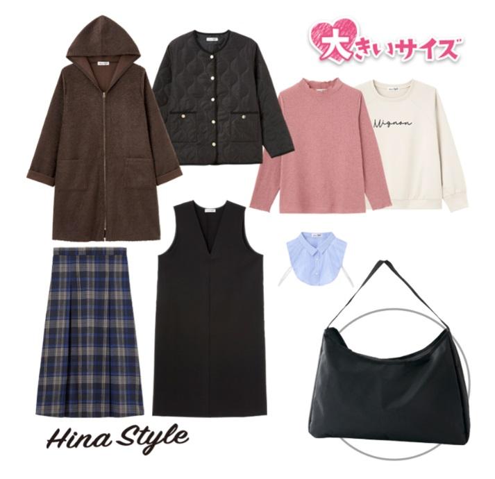 ぽっちゃりコーデを発信するインフルエンサー「Hina」さんとのコラボ福袋です。なんとアウターはロングコート&キルトジャケットの2点入り。ほか洋服は計4点入っています。大きいサイズ(LL・3L・4L)での展開です。