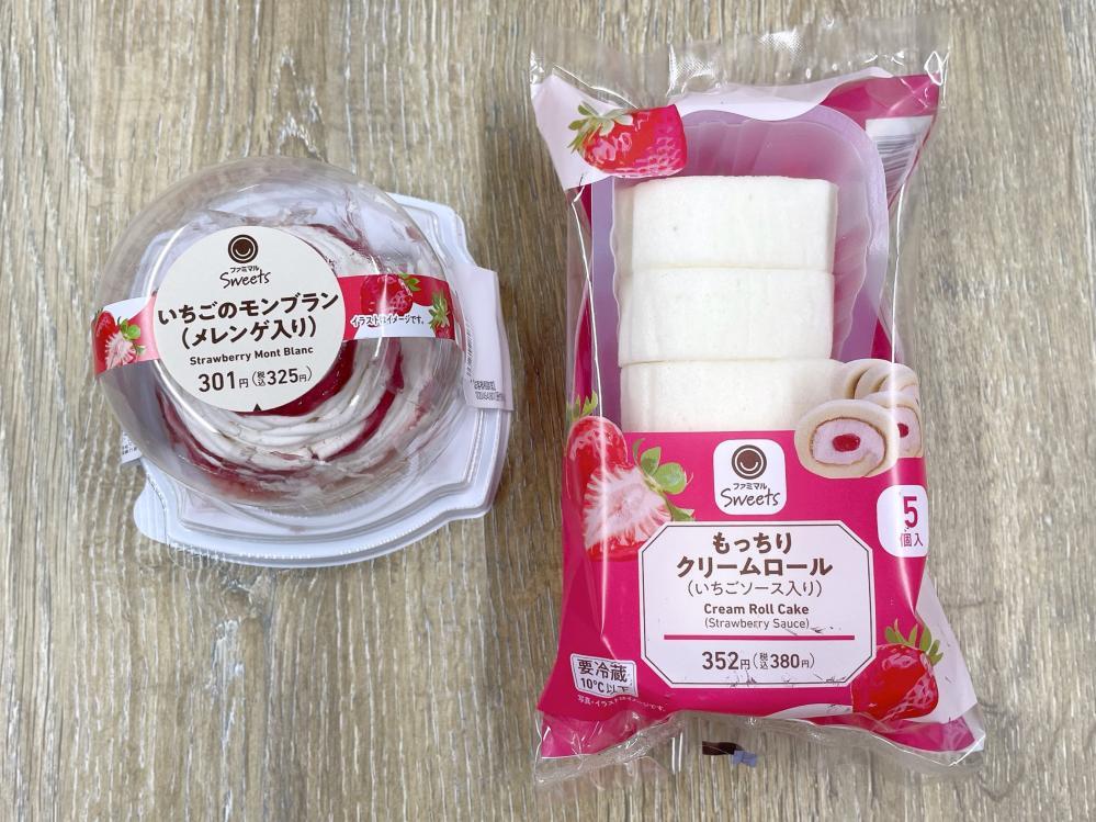 12月30日発売のデザートは、いちごクリームといちごソースがたっぷり詰まった「もっちりクリームロール(いちごソース入り)」(380円)と、ホワイトチョコ入りのクリームと甘酸っぱいいちごのマリアージュを楽しめる「いちごのモンブラン(メレンゲ入り)」(325円)の2種類。