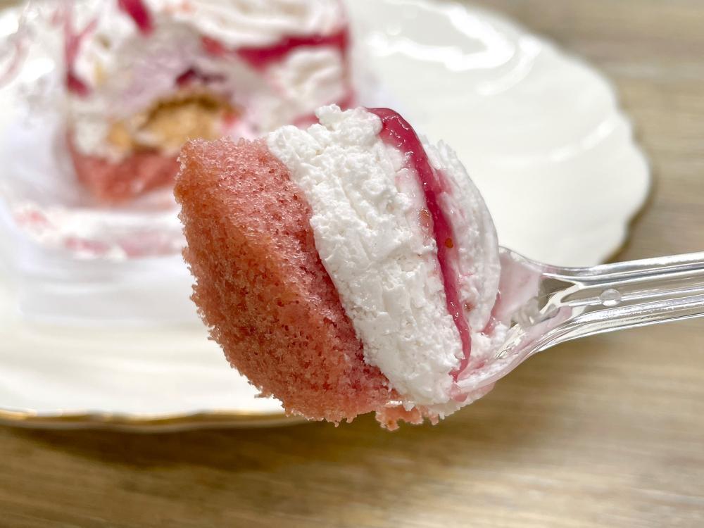 さらにスプーンを進めていくと、サクッ、ホロッなメレンゲに、ほのかにいちごが香るピンク色スポンジが出現。風味や食感に立体感を生み出しています。