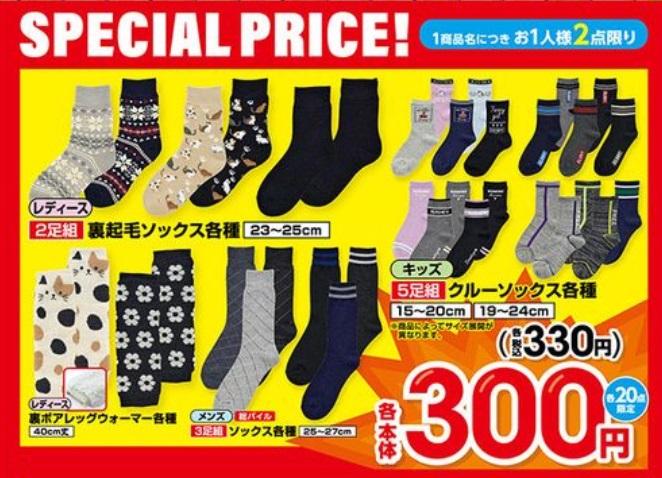 ほか、靴下や下着がスペシャルプライスで売り出されています。目玉はキッズ向けクルーソックス(15~20cm/19~24cm)5足組・330円、キッズ向けインナー(120cm~160cm)3枚組・550円などです。