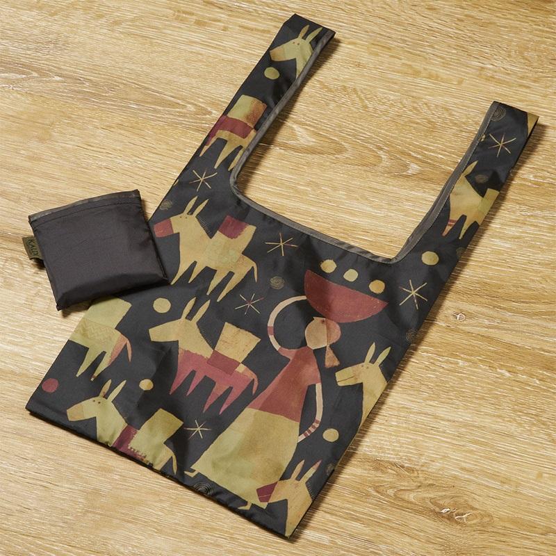 折りたたんで内側のポケットにしまい込むことができるレジ型のエコバッグです。持ち手はほどよい長さ(約50cm)で、手持ちも肩掛けもできます。