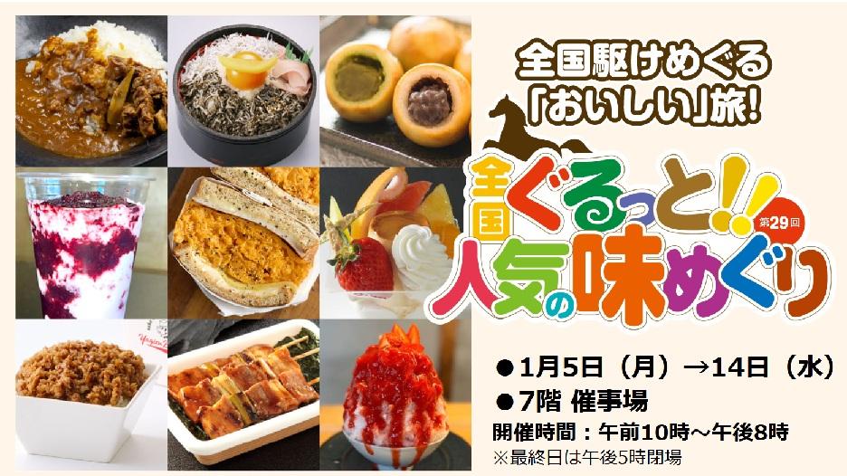 2026年1月5日から14日まで、大丸札幌店(札幌市中央区)7階催事場にて「第29回 全国ぐるっと!!人気の味めぐり」が開催されています。その場で食べられる実演販売多数! 全国各地のおいしいものが、ズラリとそろうグルメイベントです。知らなかった味や、見つけるといつも食べたくなる味に出会えます。イートインでは、出来立てを味わえる「できたて味わい処」、名だたる人気店や自宅でなかなか作れない名店のメニューが揃っている「やみつき美味処」、そしておいしいスイーツが楽しめる「ごほうび甘味処」と、3つのセクションでの実演販売があります楽しめます。おいしいものめぐりで、いい一年をはじめませんか。 開催時間は10時から20時(最終日は17時)までです。