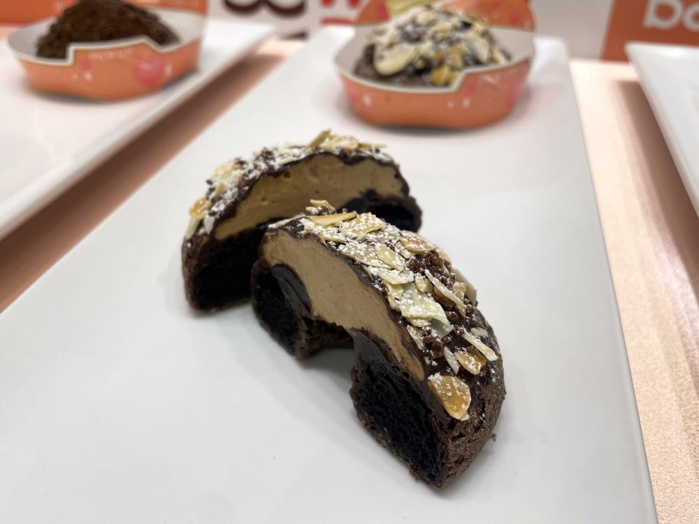 こだわりのショコラドーナツ生地を堪能できる商品がもう一つ。雪山のような美しいビジュアルが目を惹くこちらは、濃厚なガナッシュクリームとプラリネホイップが主役。
