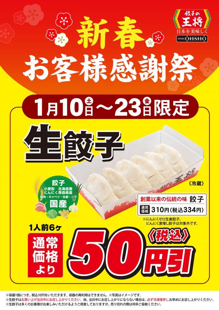 餃子の王将は、2026年1月10日から23日の期間限定で、持ち帰りの生餃子が50円引きになる「新春お客様感謝祭」を開催します(一部店舗を除く)。