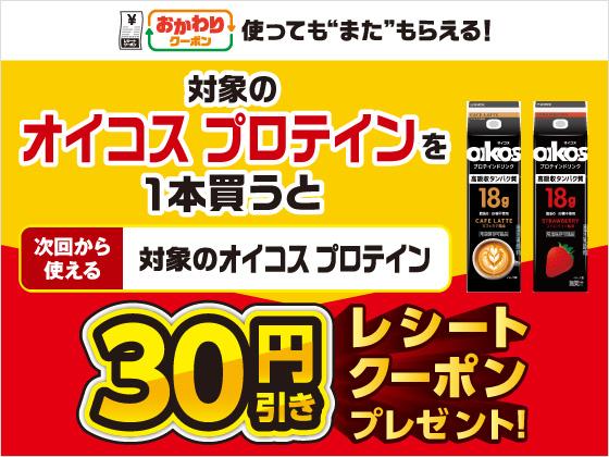 1月13日から26日までの期間、対象の「オイコス プロテイン」を1本購入するごとに、次回から使える30円引きクーポンがもらえます。
