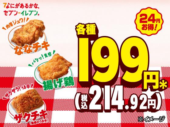 1月13日から19日までの期間、ななチキ・揚げ鶏・ザクチキ(魅惑のうま辛)が通常価格(税別)の24円引きになります。