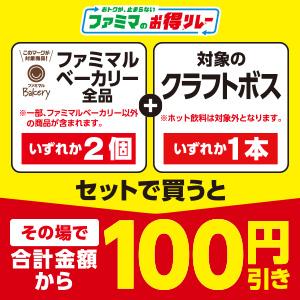 1月13日から26日までの期間、ファミマルベーカリー全品からいずれか2個と、対象のクラフトボスからいずれか1本をセットで購入すると、合計金額から100円引きになります。