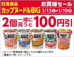 1月13日から19日までの期間、対象の日清「カップヌードルBIG」を2個同時に購入すると100円引きになります。