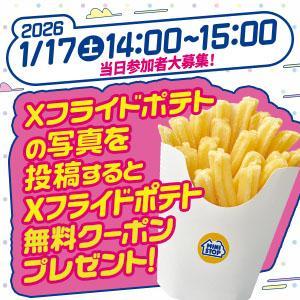 1月17日14時から15時まで、ミニストップの公式Xをフォローし「#バリとXポテ活」「@ministopfan」をつけてXフライドポテトの画像を投稿すると、Xフライドポテト無料クーポンがもらえます。