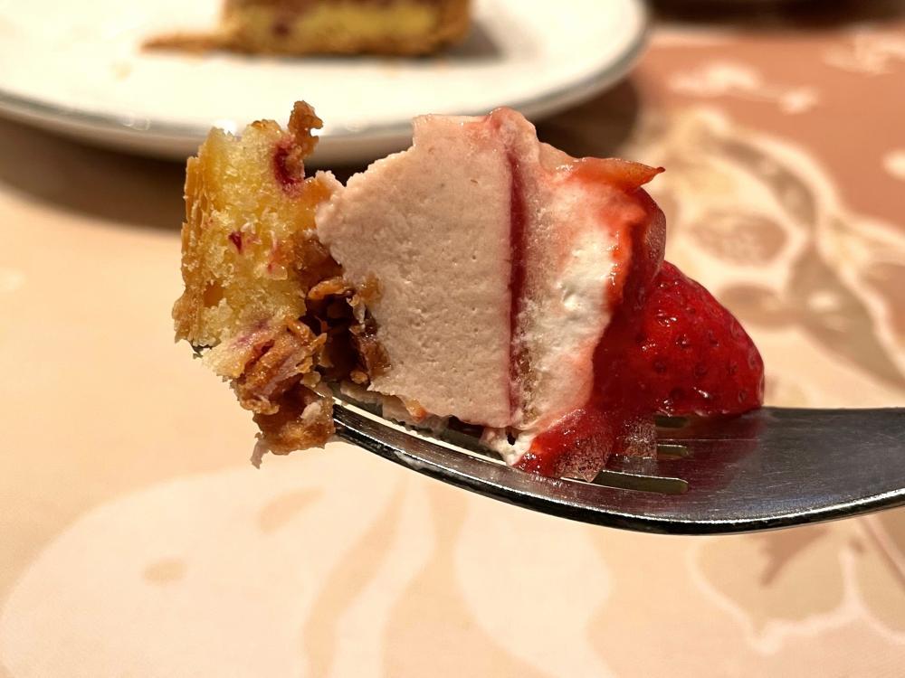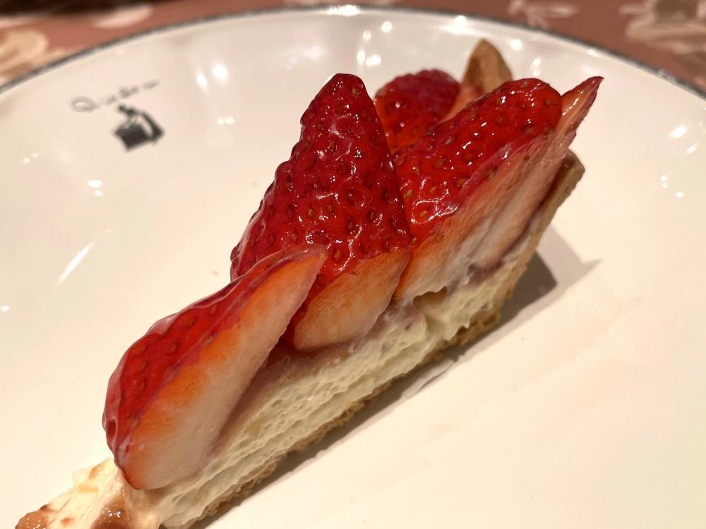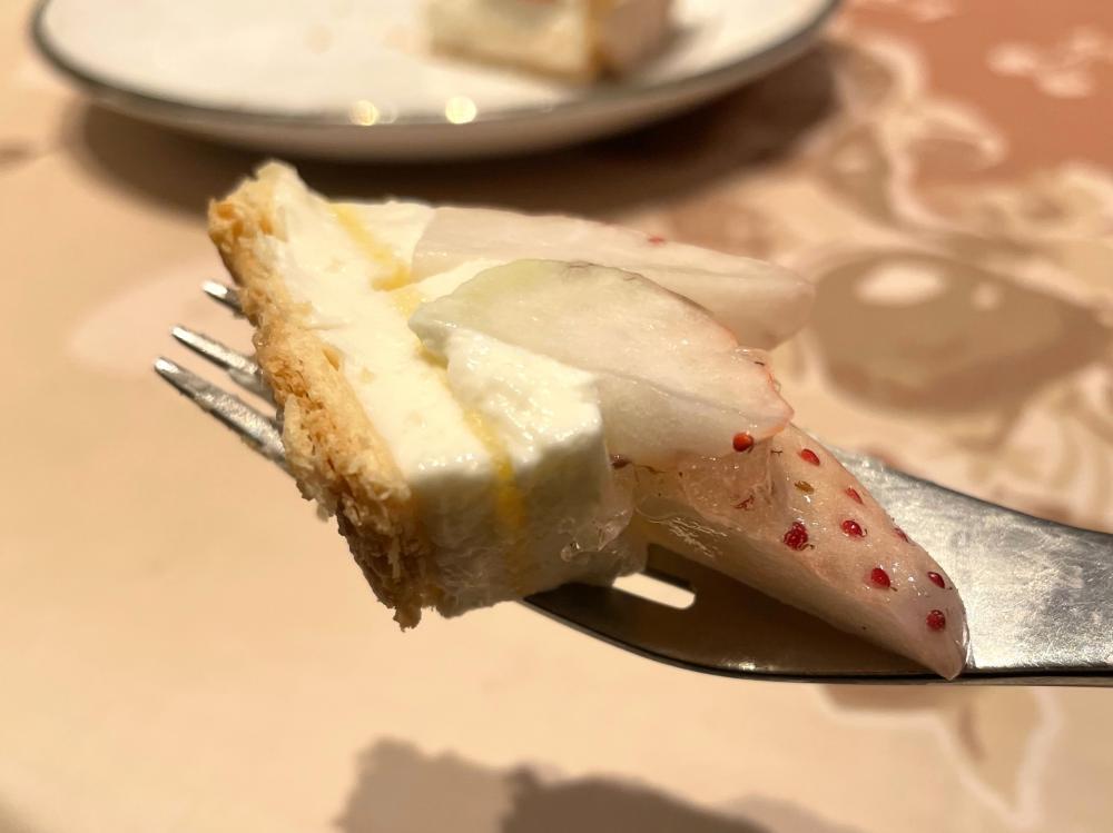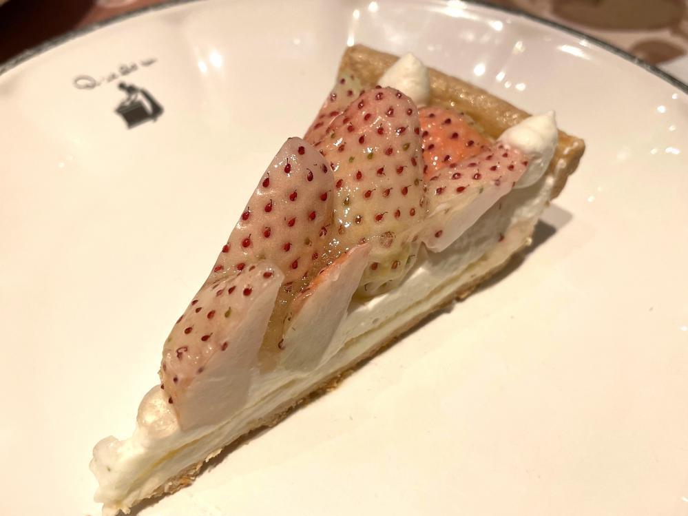 ベースとなるのは、柔らかな甘みのバニラ風味のババロアと、バターをたっぷり使ったパイ生地。風味と食感が驚くほど繊細で、白イチゴの美味しさをグンと押し上げている......! ババロアがイチゴの華やかな香りと果汁を優しく包み込み、品のあるサクッと食感で締めくくります。