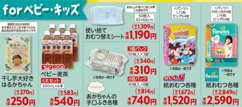 ほか、消耗品のベビー用品は、「干し芋大好きはるかちゃん」(270円)やピジョン「ベビー麦茶」(500ml×6本セットで583円)がチラシでピックアップされています。