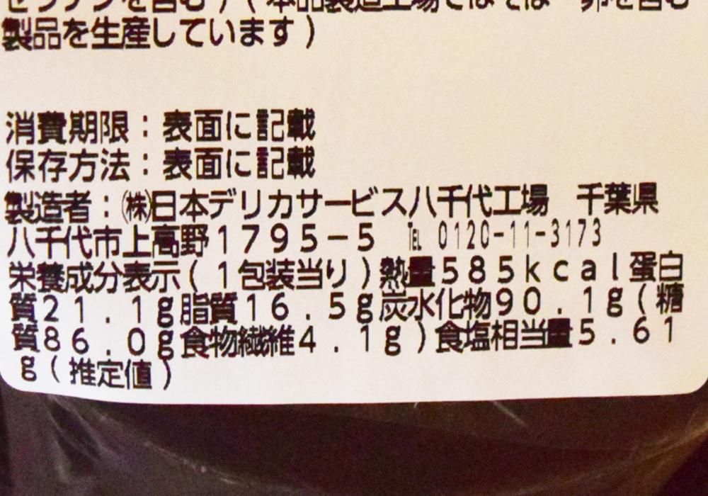 1包装あたり585kcal、たんぱく質21.1g、脂質16.5g、炭水化物90.1g、食塩相当量5.61gです。