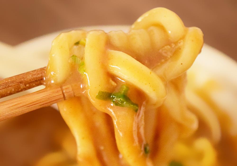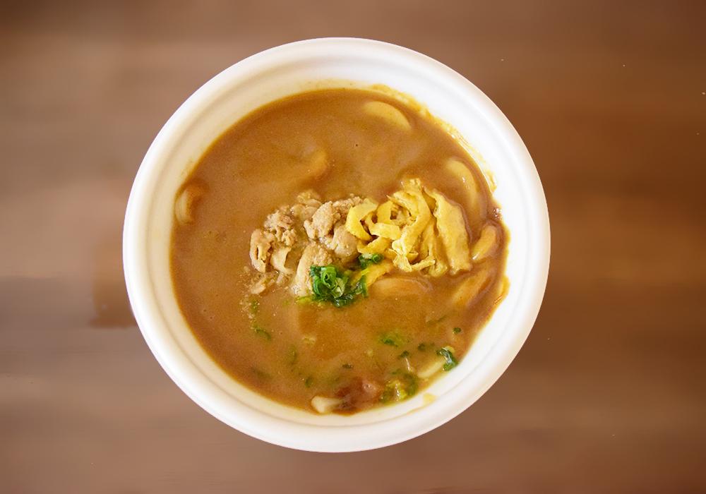国産小麦粉を使用したうどんに、スパイシーでまろやかで濃厚なカレーを合わせています。東北・近畿地域のローソンでは取り扱いありませんので注意。