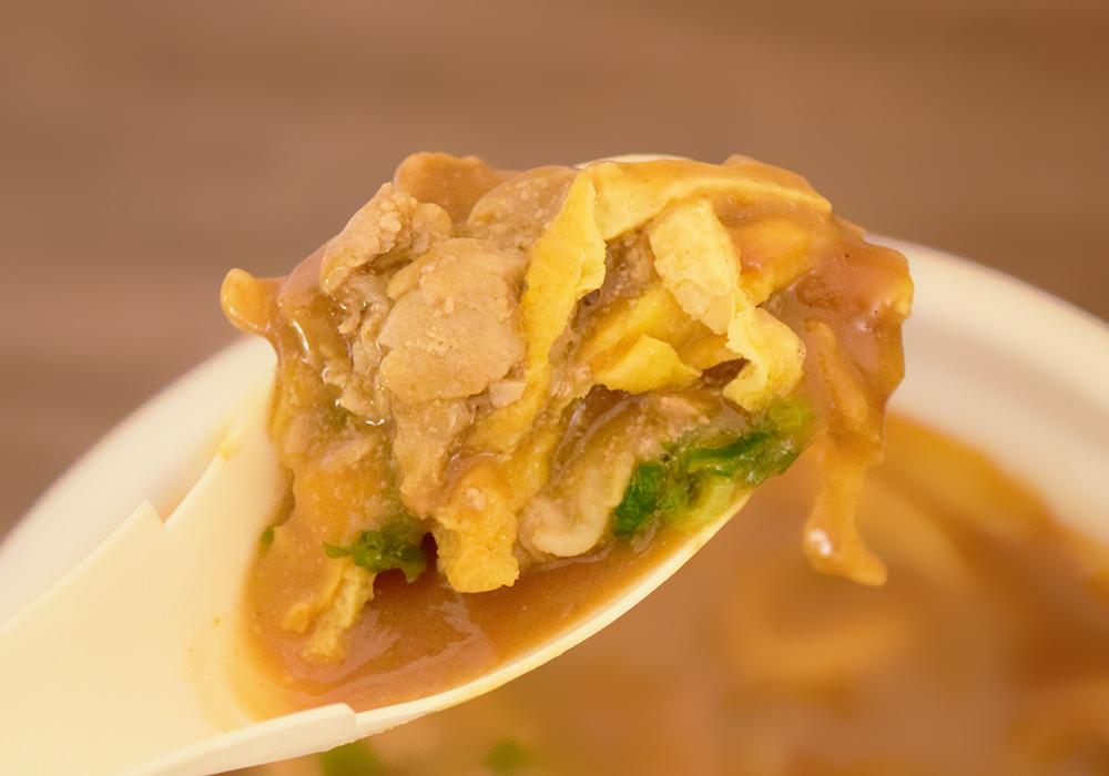カレースープはもったりとした質感でコクがあり、全体的にまろやかな仕上がりです。スパイス感はそこそこ。辛さはほとんど感じられず、今回食べ比べた3品の中では最もマイルドな味わい。豚肉もほどよく入っており、満足感があります。