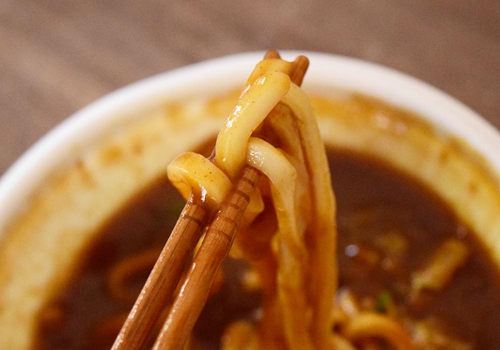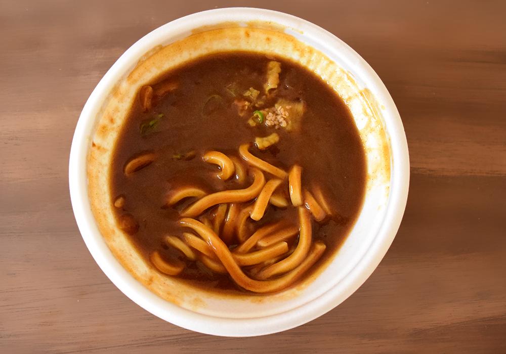 カレースープはややもったりとした口当たりで、コクのある味わいです。牛肉の旨味がしっかりと溶け込んでおり、肉系のカレーうどんが好きな人にはぴったり。辛さは控えめながらも、ローソンの商品と比べると、やや辛さが感じられました。