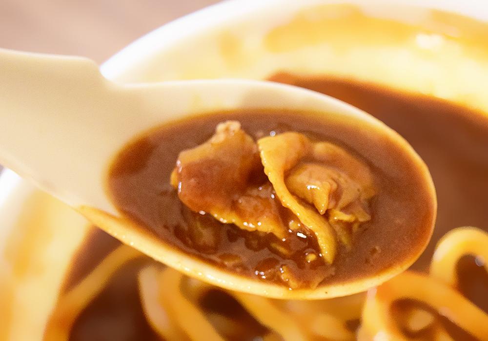 弾力のあるうどんに、香り豊かなスパイスをベースに、オニオンやチャツネ、牛のコクを加えたカレーソースを合わせ、深みのある味わいに仕上げています。なお、本商品は東北および関東の店舗限定での販売です。