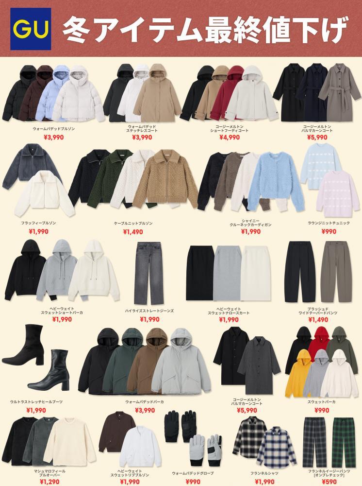 GU(ジーユー)の冬アイテムがついに"最終値下げ"に突入しました。GUのXアカウント(@gu_global)は2026年1月22日から23日にかけて、値下げアイテムを紹介しています。