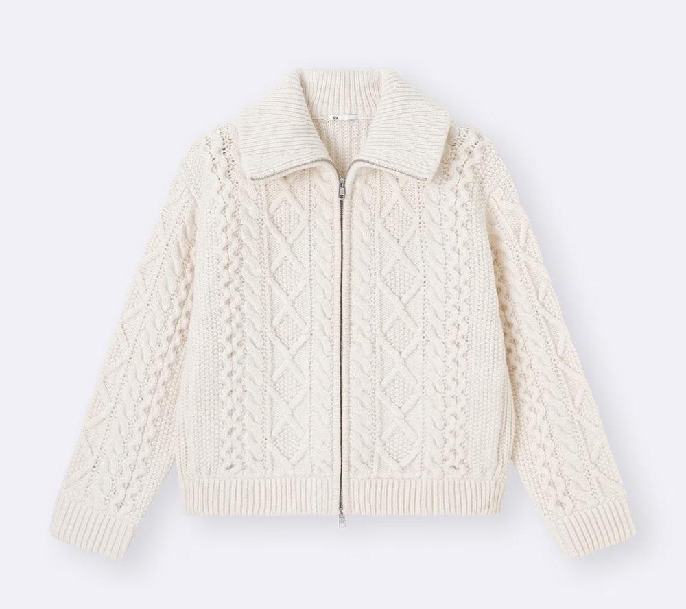 数種類のケーブル柄を組み合わせた立体的な編地がポイントです。好みの位置で開閉可能なダブルジップ仕様で、着こなしの幅が広がります。