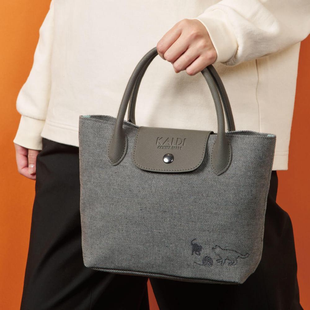 大人なグレーカラーのダンガリー調生地のバッグに、ネコたちの刺繍がさりげないアクセントに。裏地にもキュートなネコ柄がプリントされています。コンパクトなサイズ感なので、近所のちょっとしたお出かけにも便利です。