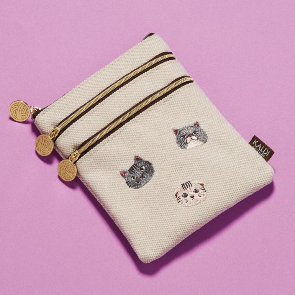 3匹の愛らしいネコの刺繍がポイントのポーチは、大きさが異なる3つのポケット付き。小物を細かく収納できる優れものです。
