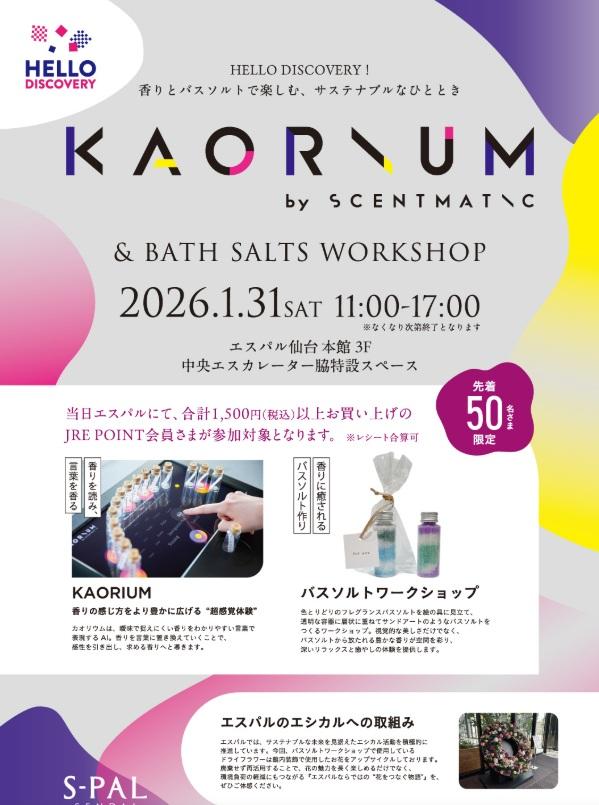 2026年1月31日、エスパル仙台(仙台市青葉区)本館3階中央エスカレーター脇特設スペースにて「KAORIUMU」が開催されます。館内装飾で使用したお花をバスソルトに エスパルの館内装飾で使用したお花をドライフラワーに加工、そのお花をハンドメイドバスソルトに使用する、サステナィブルなワークショップが開催されます。香りの感じ方をより豊かに広げるAI「KAORIUMU」を使用することで、香りというあいまいでとらえにくいものを言葉に置き換えて、求める香りへと近づいていく体験が可能です。エスパルならではの「花をつなぐ物語」を、お気に入りの香りとともに楽しんで。 開催時間は11時から17時までです。先着50名。参加条件があるので詳細は公式サイトを確認してください。