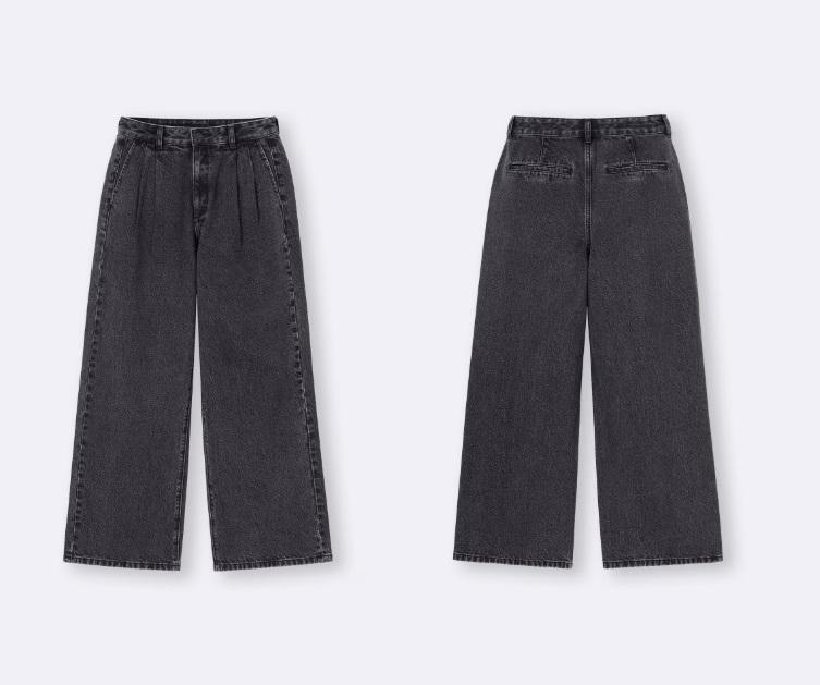 ワイドストレートなシルエット&ハイウエストで脚長効果が期待できます。ポケットは前左右に2つあり、後ろの2つは飾りポケットです。
