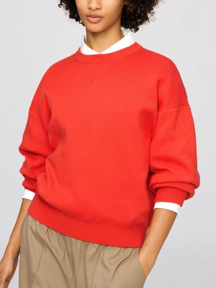 UNIQLO : Cから登場しているセーターは、まるでスウェットのようなデザインとシルエット。コットン100%で肌に優しく、ショート丈で幅広いボトムスと相性抜群です。