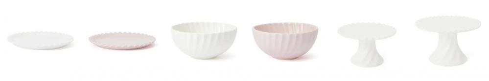 カラーは、プレートとボウルがホワイト、ピンクの2色展開。ケーキスタンドはホワイトのみです。価格はプレートが各1000円、ボウルが各800円。S 1200円、L 2000円です。