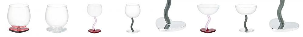 台座部分がハート形のタンブラーやワイングラス、デザートグラスも展開。個性があってどれもキュートです。