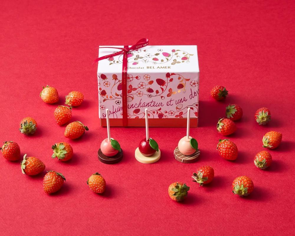 国産苺の甘酸っぱさをぎゅっと閉じ込めた自家製フルーツジュレ入りショコラ。「紅ほっぺ」「とちあいか」「あまおう」といった、人気品種3種の苺を華やかに仕上げた棒付きショコラです。