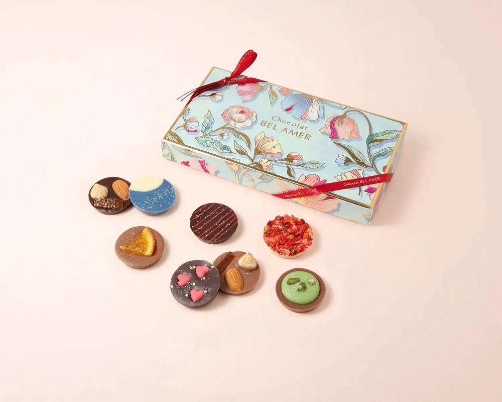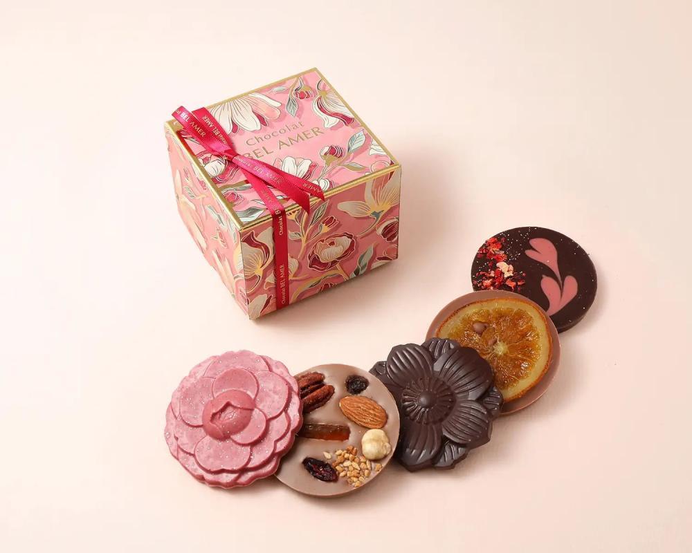 可愛らしいミニサイズの板チョコレートを詰め合わせた、華やかな印象のギフトセットです。