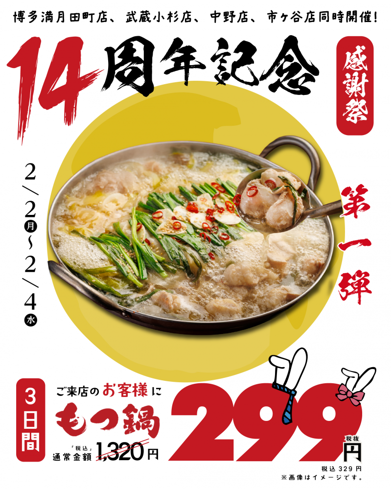第一弾は、2月2日から4日までの3日間、看板メニューのもつ鍋が通常価格1320円のところ、329円の超特価に。このあとも、お得な企画が続きます。