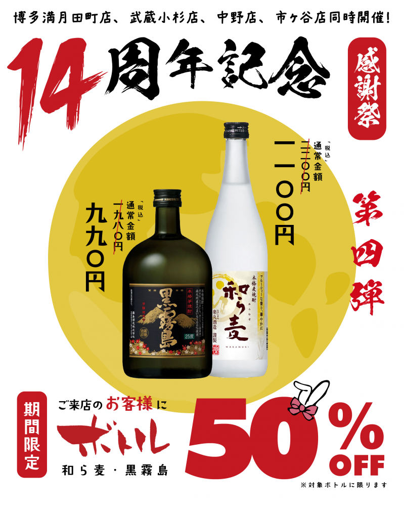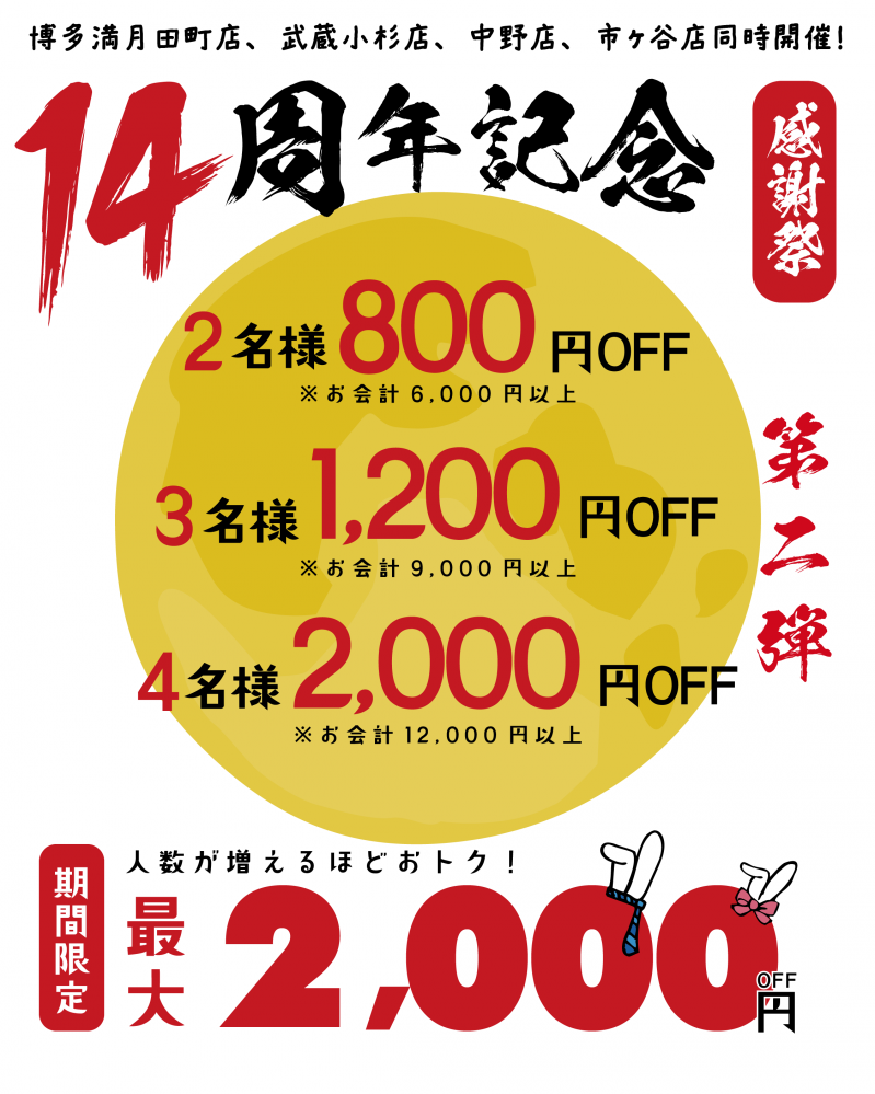 開店から14周年を迎える「博多満月」田町店を記念して、4店舗合同で割引サービスや飲み放題880円など、週ごとに内容が異なる超お得なイベントを開催中です。