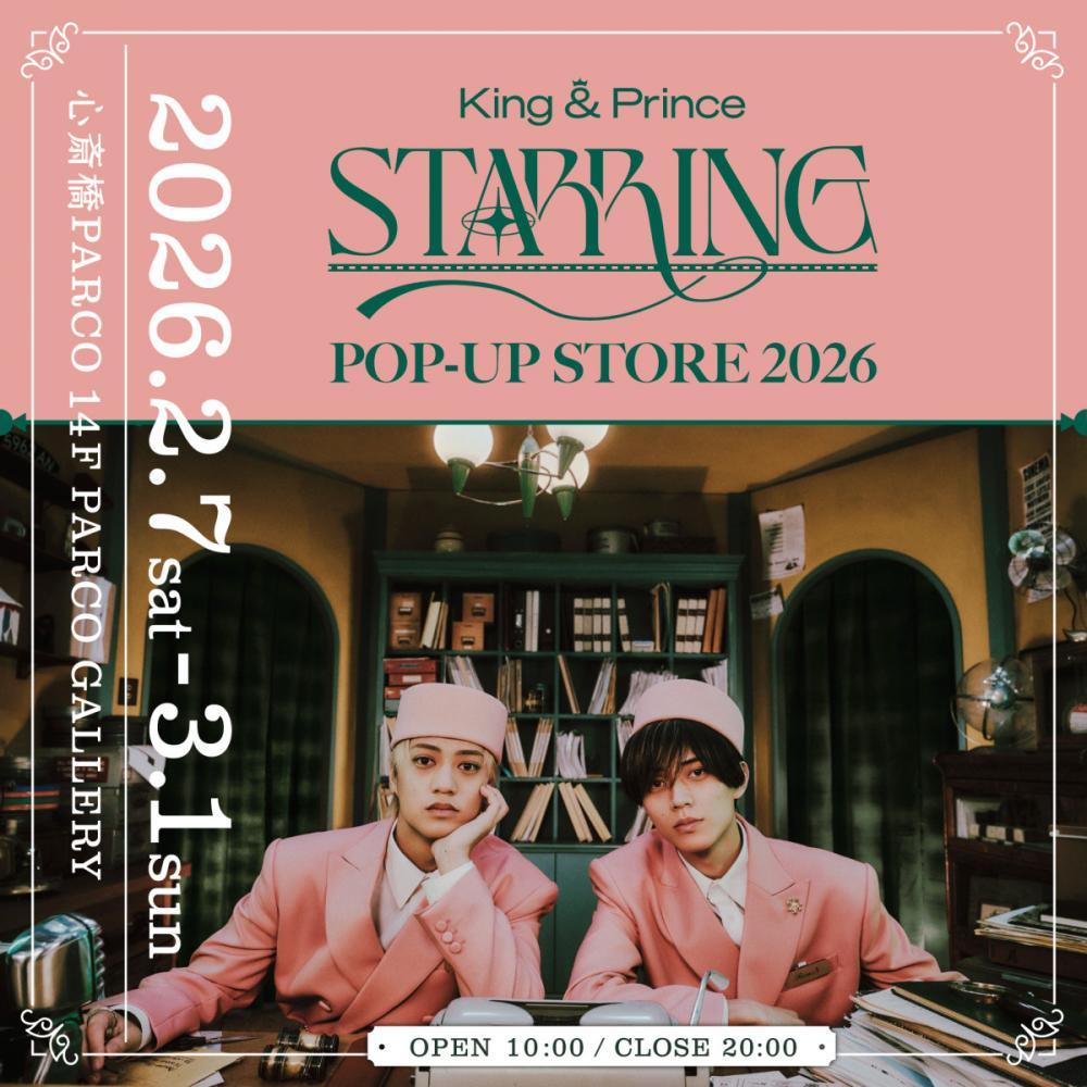 2026年2月7日から3月1日まで、心斎橋PARCO(大阪市中央区心斎橋筋1丁目8-3)14階PARCO GALLERYにて、「King & Prince POP-UP STORE 2026 『STARRING』」が開催されます。