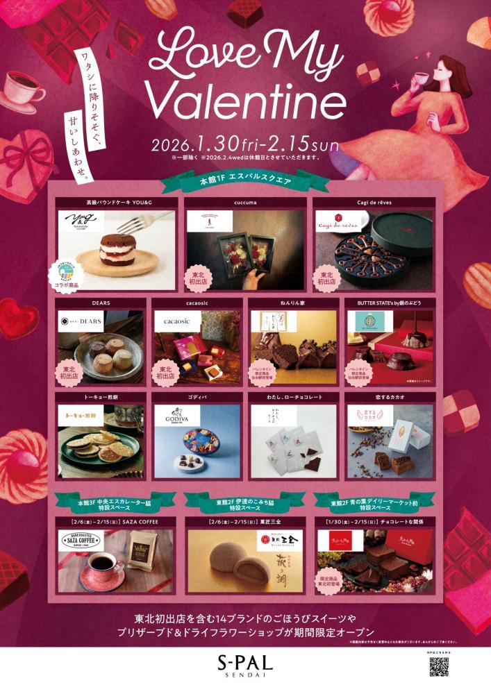 2026年1月30日から2月15日まで、エスパル仙台(仙台市青葉区)本館1Fエスパルスクエア、3F中央エスカレーター脇特設スペース、東館2F伊達のこみち脇特設スペース、青の葉デイリーマーケット前特設スペースにて、「Love My Valentine POP UP STORE」が開催されています。