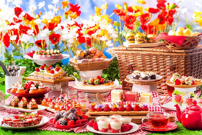 旬のいちごを主役にした本ブッフェ。国産いちごをたっぷりと使用したショートケーキやパイ、ミルクボトルやドリンクバックを用いたピクニック風のいちごミルクプリンなど、約12種類のスイーツが揃っています。