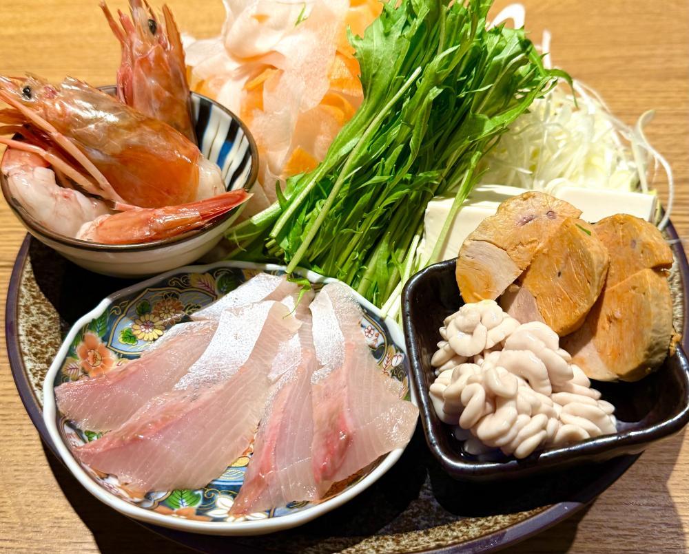 至福の海鮮鍋には、大粒赤海老、ブリ、白子、あん肝が入っています。それぞれの素材から濃縮された出汁の旨味で、〆の雑炊までしっかりと楽しむことができます。