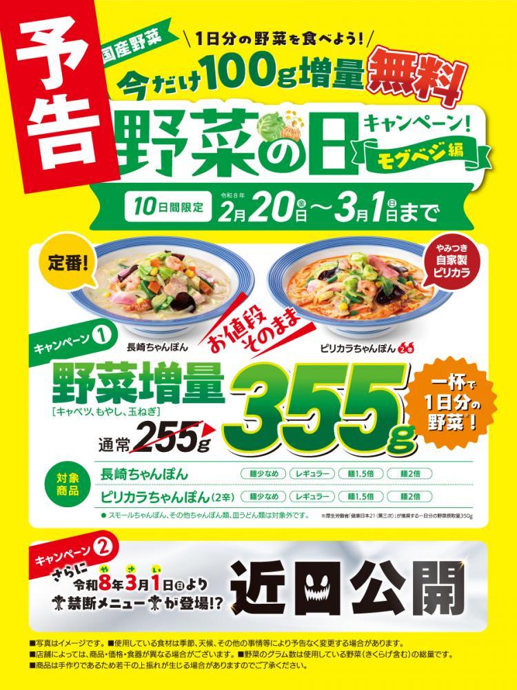 長崎ちゃんぽん専門店のリンガーハットは、2026年2月20日から3月1日までの期間、対象メニューの野菜を増量するキャンペーンを実施します。