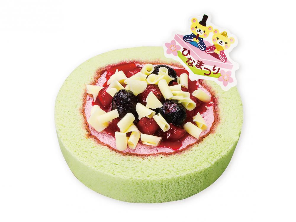 「春色ひなロール」はひな壇に飾られる3色のひな餅をイメージしたスイーツです。緑色の生地でピンクのストロベリークリームを巻き、白色のホワイトチョコとベリーソースをトッピングしています。
