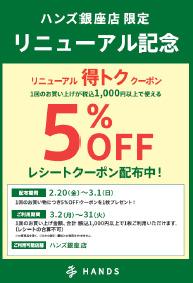 リニューアルオープンを記念して、2月20日から3月1日までの期間中、ハンズ銀座店で買い物した人に5%OFFクーポンを配布します(一部商品を除く)。