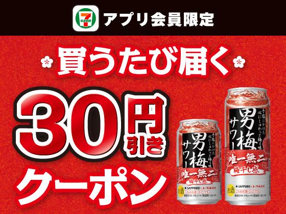 2月19日から3月4日までの期間、セブン-イレブンアプリを提示して「男梅サワー」(350ml/500ml)を購入するごとに、30円引きクーポンがもらえます。